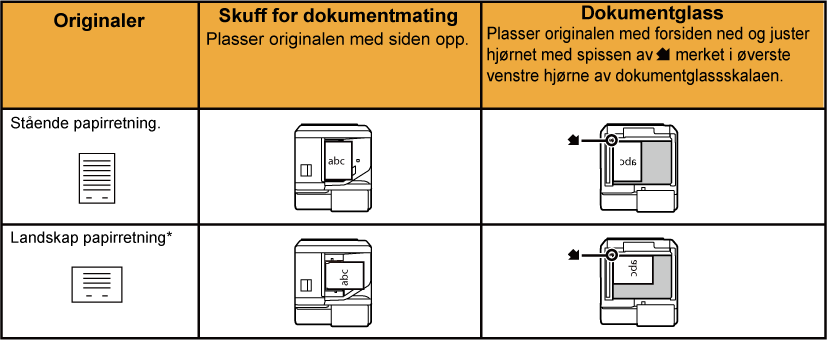 Plasser originalen i skuffen for dokumentmating på den automatiske dokumentmateren, eller på dokumentglasset.Advarsel