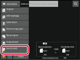 Når fargemodusinnstillingen er [Full farge] i skannemodus, sendes bildet i Mono2 til faksadresser og i farger til skanneadresser. Hvis du vil sende bildet i Mono2 til alle adresser, trykker du på [Send samme bilde som faksadresse] på handlingspanelet i normal modus. |