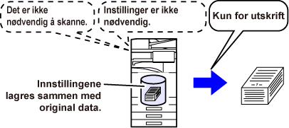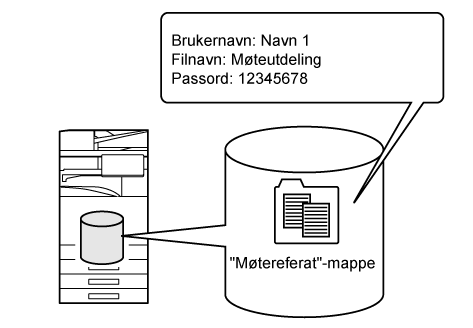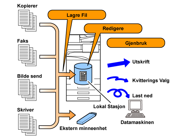 Når kopiering, bildesending eller en annen jobb utføres, lagrer denne funksjonen dokumentdata til den lokale stasjonen. Bruk denne funksjonen når du vil lagre dokumentdata raskt og enkelt uten å spesifisere et filnavn eller annen informasjon. Andre kan også bruke den lagrede filen. Ikke bruk denne metoden for å lagre filer som du ikke ønsker at andre skal bruke. |