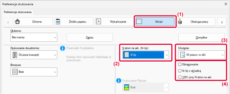 na arkuszu) lub [4-Up] (4 strony na arkuszu) wydruk będzie wyglądać