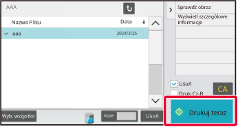 Można wybrać wiele plików. Dotknięty plik zostanie oznaczony znacznikiem wyboru. Aby zaznaczyć wszystkie pliki w folderze, naciśnij przycisk [Wybierz wszystko]. Aby usunąć zaznaczone pliki, naciśnij przycisk [Usuń]. Wybierz jeden z plików i naciśnij "Sprawdź obraz" na panelu akcji, aby sprawdzić podgląd danych do druku. Ekran podglądu obsługuje się tak samo jak podczas sprawdzania obrazów w przypadku przechowywania dokumentów. Patrz " SPRAWDZANIE OBRAZU PLIKU". Możesz również nacisnąć "Wyświetl szczegółowe informacje" na panelu akcji, aby sprawdzić szczegółowe informacje, takie jak rozmiar wydruku pliku. Aby wydrukować plik, przejdź do następnego kroku.