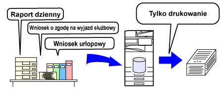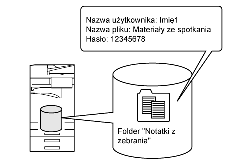 Funkcja ta zapisuje dane dokumentu na dysk lokalny, gdy wykonywane jest zadanie kopiowania, wysyłania obrazów lub inne. W przeciwieństwie do funkcji Przechowywanie Tymczasowe, podczas zapisywania do pliku można dołączyć różnego rodzaju informacje, aby umożliwić wydajne zarządzanie tym plikiem. Można również ustawić hasło. |