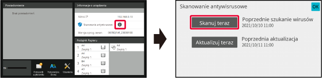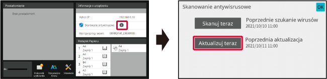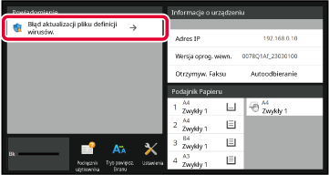 Jeśli w danych wejściowych wykryty zostanie wirus, na panelu dotykowym zamieszczona zostanie stosowna informacja, dane wejściowe lub zadanie zostaną anulowane, a dane wejściowe lub dane do wydrukowania zostaną usunięte. Dane ze źródła danych wejściowych (pamięć USB, serwer zewnętrzny itp.) nie zostaną usunięte. Jeśli w danych wyjściowych wykryty zostanie wirus, na panelu dotykowym zamieszczona zostanie stosowna informacja, dane wyjściowe lub zadanie zostaną anulowane, a dane wyjściowe lub dane do wydrukowania zostaną usunięte. W oknie "Powiadomienia" ekranu Informacje systemowe pojawi się komunikat o wykryciu wirusa. |