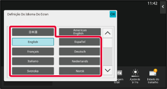 Estas definições poderão solicitar a introdução da sua palavra-passe de utilizador. Se não tiver sido efetuada a autenticação do utilizador, será necessário introduzir a palavra-passe de administrador.Selecione o idioma que pretende alterar a partir da lista.