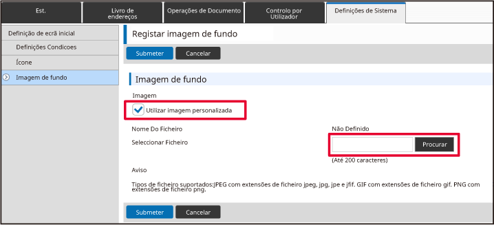 Clique no botão [Procurar] e selecione a imagem a introduzir.Finda a configuração das definições, clicar no botão [Submeter].