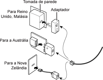 Insira a ficha de uma extremidade do cabo da linha telefónica na tomada da linha telefónica (LINE) da máquina, conforme ilustrado até encaixar, e insira a outra ficha na tomada telefónica de parede até encaixar.