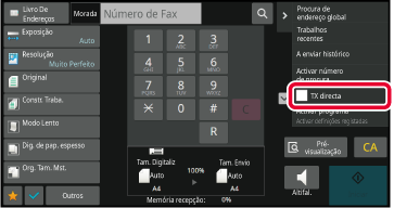 VIDRO DE EXPOSIÇÃOEspecifique o número de fax do destino e toque em [TX directa] no painel de ações.