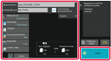 Coloque o original na bandeja do alimentador de documentos do alimentador automático de documentos ou no vidro de exposição.Verificar o nome do ficheiro e a localização para guardar e tocar nas teclas das definições que pretender selecionar.