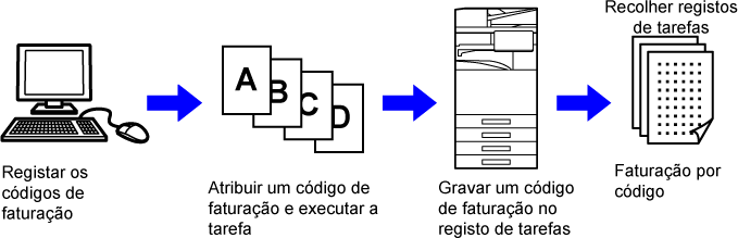 Utilizado para categorizar os resultados dos trabalhos de impressão e envio executados para permitir uma gestão eficaz. Por exemplo, pode atribuir um código por cliente e recolher informações sobre custos por cliente do registo de trabalhos. Exemplo de código: Emissão da empresa A |