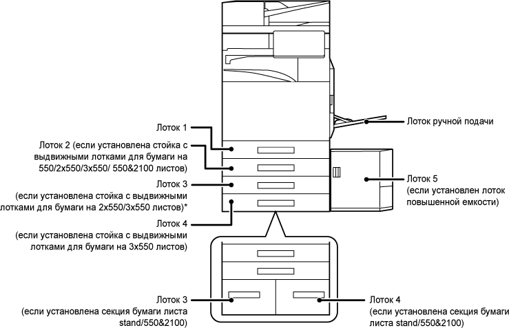 *1 Если установлена стойка с выдвижными лотками для бумаги на 550 листов, стойка с выдвижными лотками для бумаги на 2x550 листов, стойка с выдвижными лотками для бумаги на 3x550 листов или стойка с выдвижными лотками для бумаги на 550 и 2100 листов.