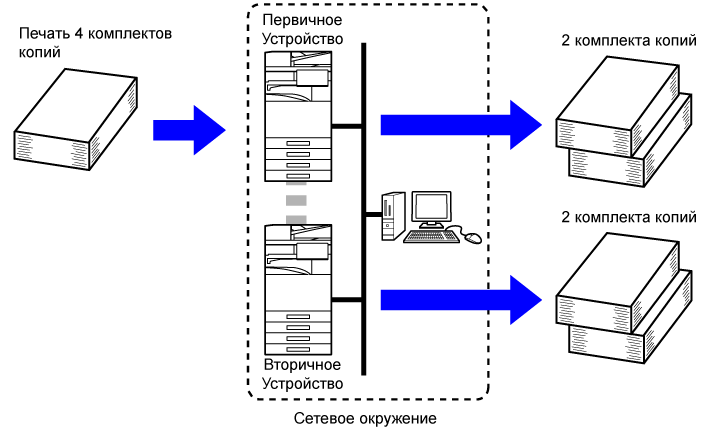 Можно установить до 9999 копий (комплектов). Указанное число копий будет распределено между первичным и вторичным устройствами. Если будет введено нечетное число копий, первичное устройство сделает больше копий, чем вторичное устройство.