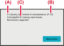 На экране подтверждения указано число сканированных листов оригинала (A), число сканированных сторон (B) и число копий, за исключением пустых страниц (C).