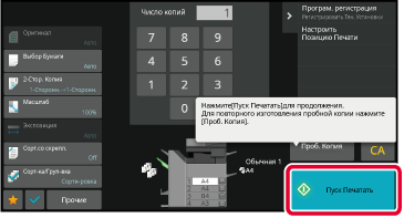 Сделайте один комплект копий.Проверьте результаты копирования. Если проблем не будет обнаружено, коснитесь кнопки [Пуск Печатать].