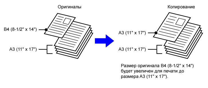 x 17"), формат оригинала B4 (8-1/2" x 14") увеличивается для печати