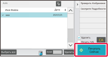 Можно выбрать несколько файлов. Файл, которого коснулись, отмечается флажком. Чтобы выбрать все файлы в папке, коснитесь кнопки [Выбрать все]. Чтобы удалить выбранные файлы, коснитесь кнопки [Удалить]. Выберите один из файлов и коснитесь "Проверить Изображение" на панели действий для предварительного просмотра данных печати. Способ управления экраном предварительного просмотра такой же, как при проверке изображений в режиме хранения документов. См. раздел " ПРОВЕРКА ИЗОБРАЖЕНИЯ ФАЙЛА". На панели действий можно также коснуться "Смотрите Подробности" для проверки детальной информации, такой как формат печати файла. Если нужно печатать файл, перейдите к следующему шагу.