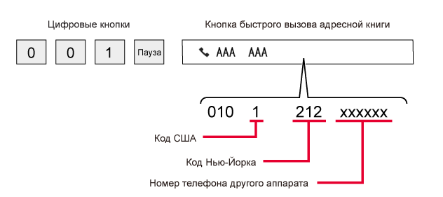 "001") и кодом страны (например, "81" для Японии), чтобы вставить паузу
