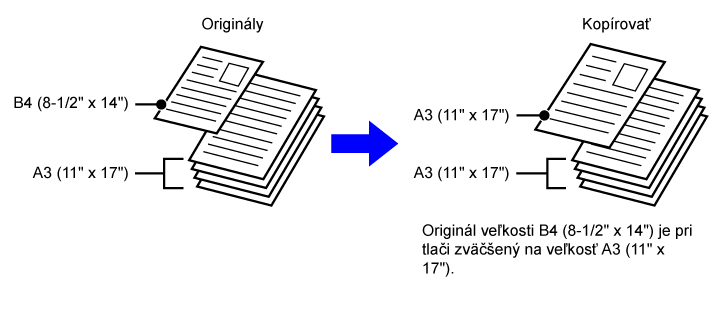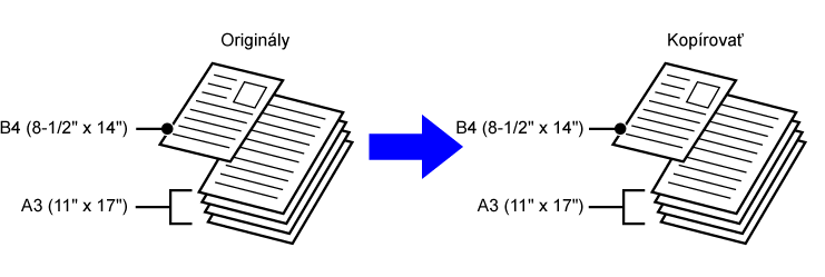 Toto nastavenie sa používa v prípade, ak majú originály 2 typy rôznych veľkostí a nemajú strany rovnakej dĺžky. Toto nastavenie je možné použiť iba v prípade nasledujúcich kombinácií veľkosti: • A3 a B4 • A3 a B5 • B4 a A5 • A4 a B5 • B4 a A4R • B4 a A5 • B5 a A4R • B5 a A5 • 11"x17" a 8-1/2"x14" • 11"x17" a 8-1/2"x13" • 11"x17" a 5-1/2"x8-1/2"