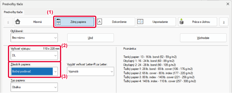 veľkosť a typ papiera používaného pre tlač a zásobník papiera.