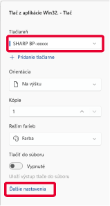 Vyberte ovládač tlačiarne pre zariadenie a kliknite na tlačidlo [Ďalšie nastavenia].
