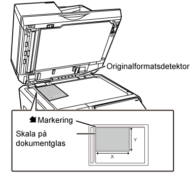 Lägg originalet med textsidan nedåt och passa in originalets övre vänstra hörn med dokumentglasets vänstra bakre hörn (vid märkets