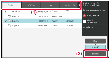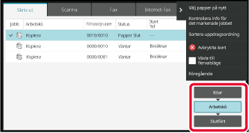 Tryck på [Köar], [Arbetskö] eller [Slutför] för