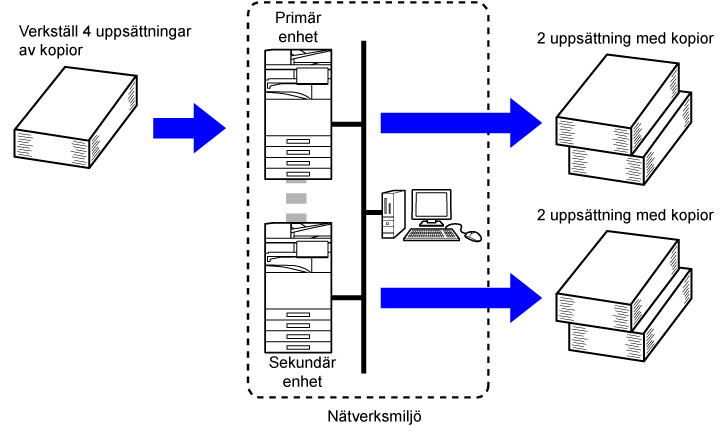 Upp till 9999 kopior (uppsättningar) kan ställas in. Det angivna antalet kopior delas mellan den primära och den sekundära enheten. Om antalet kopior är udda gör den primära enheten fler kopior än den sekundära enheten.