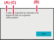 På bekräftelseskärmen visas antalet skannade originalark i (A), antalet skannade sidor i (B) och antalet kopior minus tomma ark i (C).