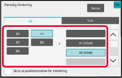 Välj fliken [AB] eller [Tum] för att komma fram till originalformatet för kopiering i affischformat och tryck på den knapp som motsvarar originalformatet.
