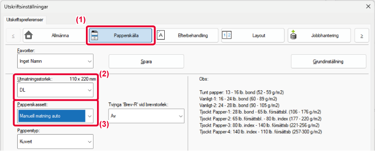 in pappersformat och typ av papper som ska användas för utskrift