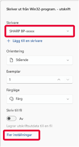 Välj maskinens skrivardrivrutin och klicka på [Fler inställningar].