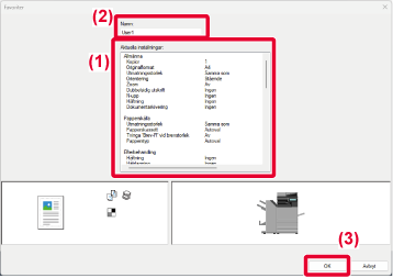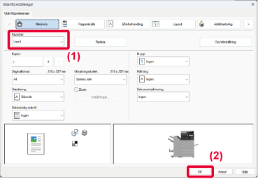 på varje flik vid utskrift kan sparas som Favoriter. Genom att spara utskriftsinställningar