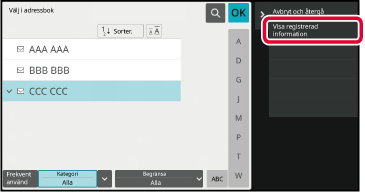 I kontaktlistan ska du trycka på "Kontakter" som innehåller adressen du vill lägga till i en "Grupp" och trycka på [Visa registrerad information] på åtgärdspanelen.