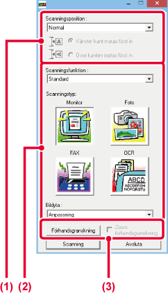 På skärmen "Standard" väljer du "Monitor", "Foto", "FAX" eller "OCR",