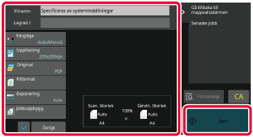 Placera originalet i dokumentinmatningsfacket i den automatiska dokumentmataren eller på dokumentglaset.Kontrollera filnamnet, spara platsen och tryck på knapparna för de inställningar du vill välja.