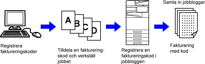 Används för att kategorisera resultatet av utförda utskrifts- och sändningsjobb för effektiv administration. Du kan till exempel ange en kundkod och samla in kostnadsinformation för kunder via jobbloggarna. Exempel på kod: Utfärdad för företag A |