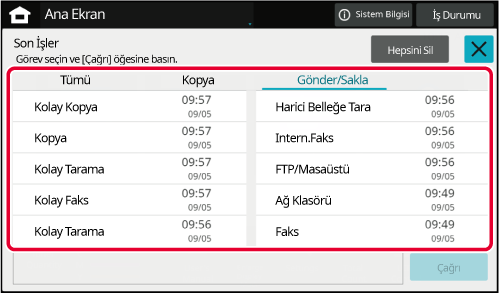 Sekmeye dokunun ve işlev tuşlarının listesi görüntülenir.