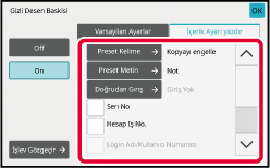 Yazdırma ayarlarını belirtmek için, önayarlı metinlerden istediğinizi seçebilir veya programlanabilir klavyeyi kullanabilirsiniz. Ayrıca seri numarasını ve hesap iş numarasını yazdırabilirsiniz.