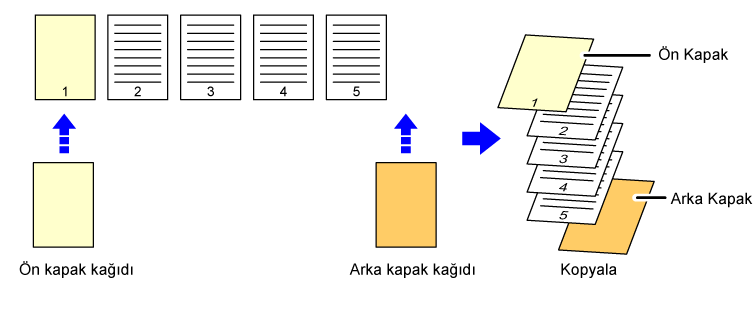 ![]() Fotokopilerin başlangıcına bir ön kapak ekler ve altıncı orijinal sayfaya arka kapak olarak 1 taraflı fotokopi çeker. * Beşinci orijinal sayfasının fotokopisi çekilmez. |