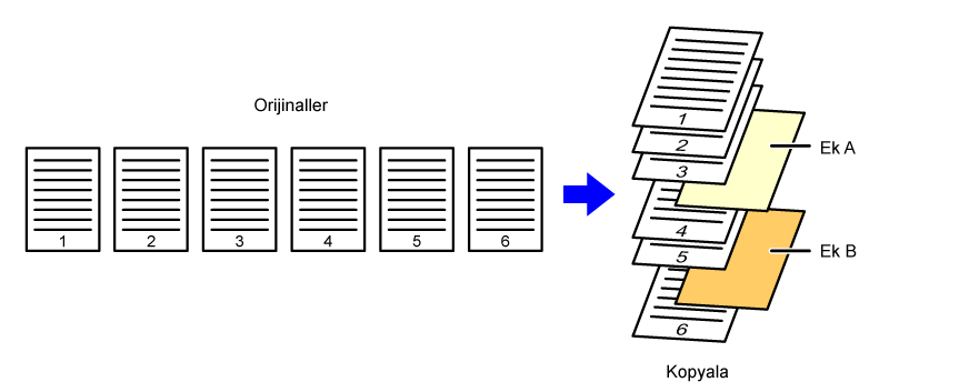 orijinale veya üç 2 taraflı orijinale ekleme sayfalarının eklenmesi gösterilmiştir.