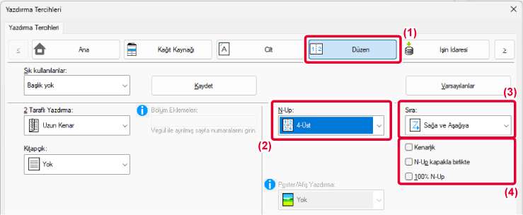 (yaprak başına 4 sayfa) seçildiğinde, seçilen sayfa sırasına bağlı olarak
