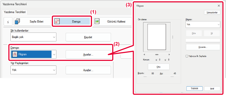 - "Damga" bölümünde [Filigran] seçip [Ayarlar] düğmesini