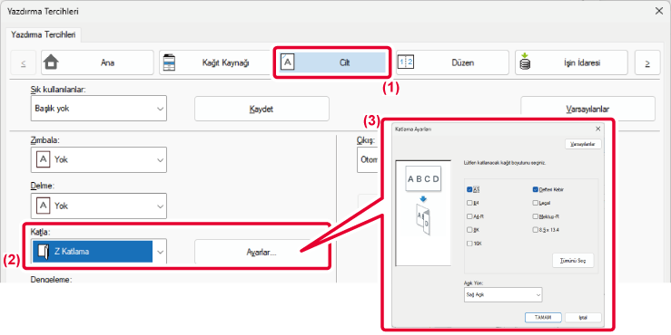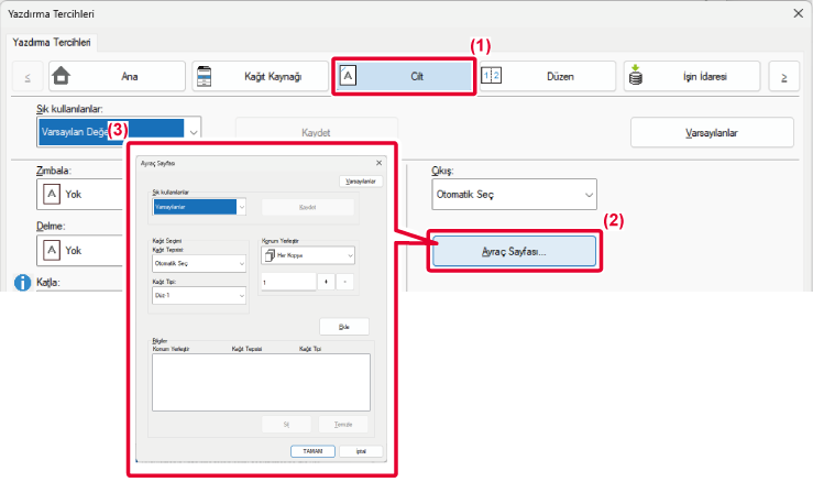 [Sayfa Ekleri seçeneği] bölümünde [Sekme Kağıdı] şıkkını seçin ve sekmelere yazdırmak