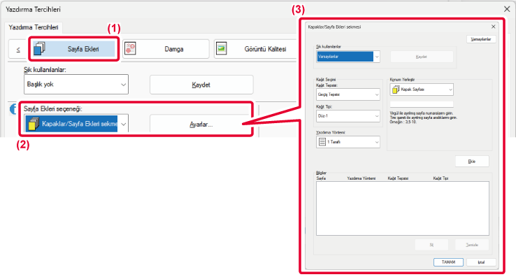 Yazıcı sürücüsü özellikleri penceresinin [Sayfa Ekleri] sekmesindeki