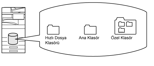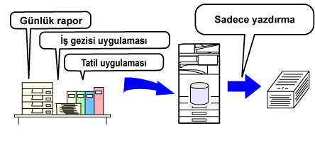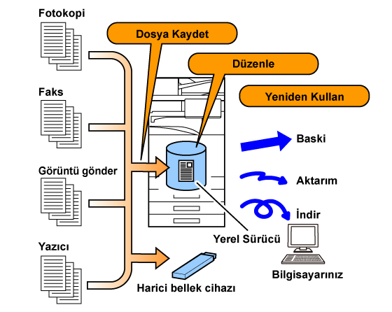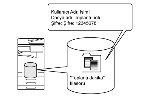 Fotokopi, görüntü gönderme ve diğer işler yapılırken bu işlev belge verisini yerel sürücüye kaydeder. Hızlı Dosya'dan farklı olarak etkin dosya yönetimi sağlamak için dosya kaydedilirken çeşitli bilgi türleri dosyaya eklenebilir. Bir parola da belirlenebilir. |