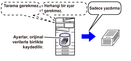 Fotokopi, görüntü gönderme ve diğer işler yapılırken bu işlev belge verisini yerel sürücüye kaydeder. Dosya adı veya diğer bilgileri girmeden hızlı ve kolay şekilde belge verilerini kaydetmek istiyorsanız bu işlevi kullanın. Kaydedilen dosya diğer kişiler tarafından da kolayca kullanılabilir. Başkalarının kullanmasını istemediğiniz dosyaları kaydetmek için bu yöntemi kullanmayın. |