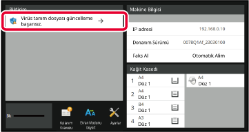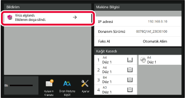 Giriş verileriyle ilgili bir virüs tespit edildiğinde, dokunmatik panelde bir virüs tespit edildiği, giriş verilerinin veya girilecek işin iptal edileceği ve çıktısı alınmak üzere olan veriler veya iş verilerinin iptal edileceği görüntülenir. Veri giriş kaynağındaki veriler (USB bellek, harici sunucu vb.) silinmez. Çıktı verilerinde bir virüs tespit edildiğinde, dokunmatik panelde bir virüs tespit edildiği, çıktı verilerinin veya çıktısı alınacak işin iptal edileceği ve çıktı verilerinin veya iş verilerinin silineceği görüntülenir. Virüs tespit mesajı, Sistem Bilgisi ekranının "Bildirim" kısmında görüntülenir. |