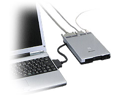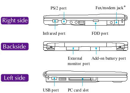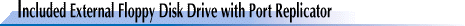 | The included floppy disk drive has a convenient port replicator for connecting a variety of peripheral devices such as a printer. Plugging devices into the port replicator instead of directly into the computer eliminates the hassle of having to disconnect several cables every time you want to take the PC-A100 series with you. Ports include Parallel, Serial, and PS/2. |