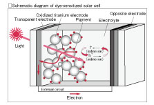 Solar cells not-using silicon that utilize a photocatalytic function of oxidized titanium become possible to oxidize organic dyes to generate electricity. Because it is possible to fabricate solar cells by means of a simple process of coating and heat curing, research toward making this technology practicable is advancing.
