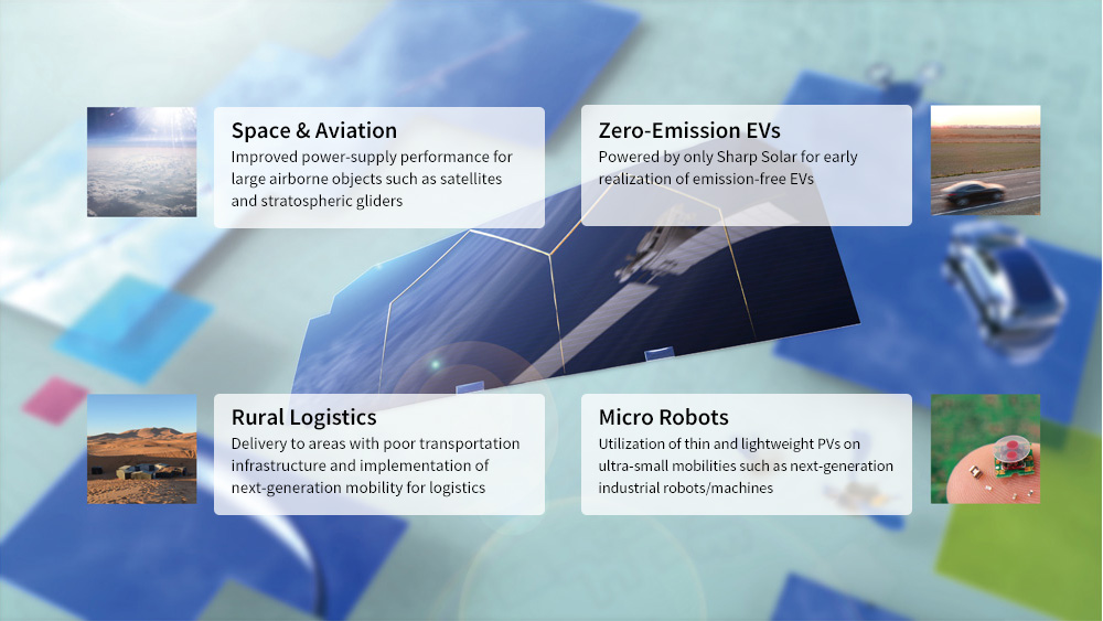 To solve energy supply problems in a wide range of fields, in addition to widely used silicon solar cells, Sharp has developed solar cells using three technologies: dye-sensitized, perovskite, and compound. Compound solar cells’ benefits include light weight, high efficiency, and the ability to conform to curved surfaces. Sharp has already implemented widespread usage of compound solar cells on artificial satellites*1 but they also hold high hope for use in aerospace, EVs, and other applications in the field of mobility. To this end, Sharp has applied its triple-junction compound solar cell module to conduct demonstration experiments with national research institutes, car makers, and other organizations. This and other efforts have resulted in the achievement of the world’s highest*2 conversion efficiency of 32.65%. The iF Design Award recognizes Sharp’s concrete vision of achieving a net-zero society by visualizing a future in which solar cells are used on vehicles such as stratospheric aircraft and EVs, and in fields such as logistics and robotics, based on the concept “To power all mobility with just solar energy.”